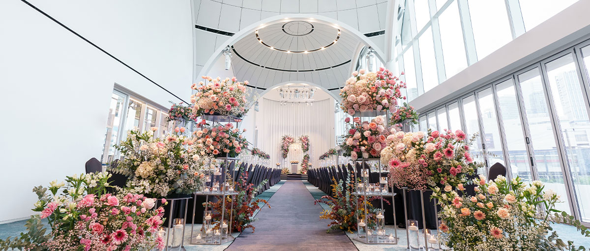 With high ceilings, an elongated aisle, and personalized floral arrangements, it creates a captivating setting that beautifully showcases the bride and groom.