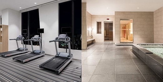 도심 전망이 보이는 큰 창문과 함께 웰니스 센터는 최신식 운동기구를 갖추고 있습니다.
